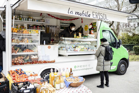 Le camion Épisol propose des produits d’épicerie de qualité – frais, secs, locaux, bios et issus de filières courtes – dont les prix sont modulés en fonction des ressources de chacun.